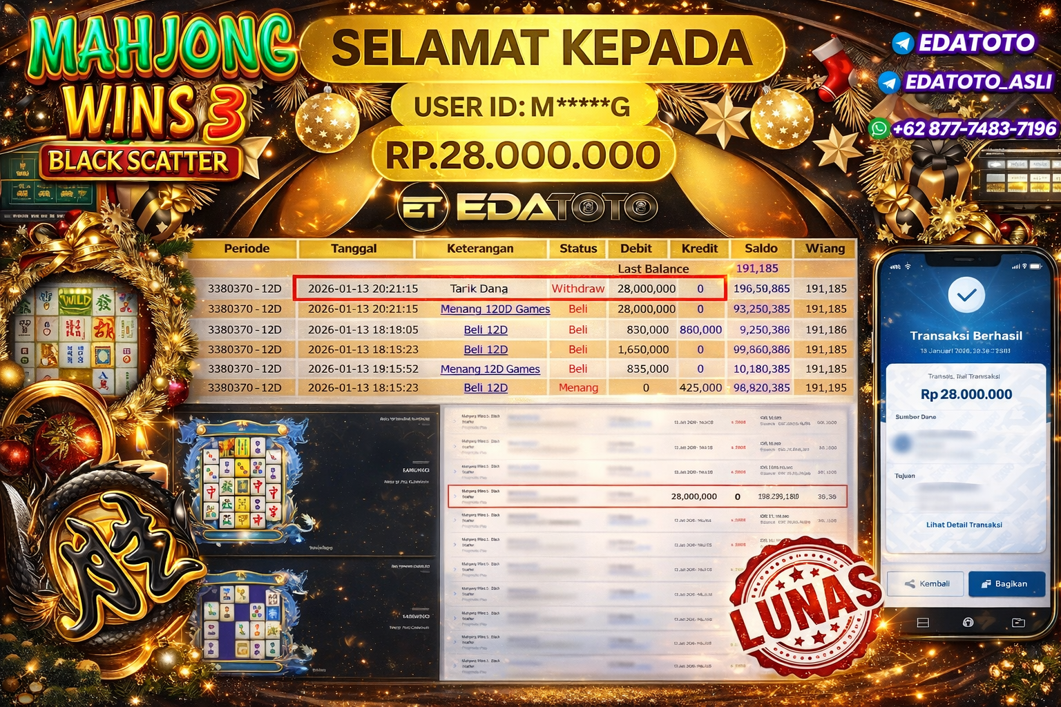 Selamat Kepada Pemilik user ID : M*****G Hari/Tanggal :kamis/ 13, Januari 2026 Jackpot : Rp. 28,000,000 JT Withdraw : 28,000,000 . . .