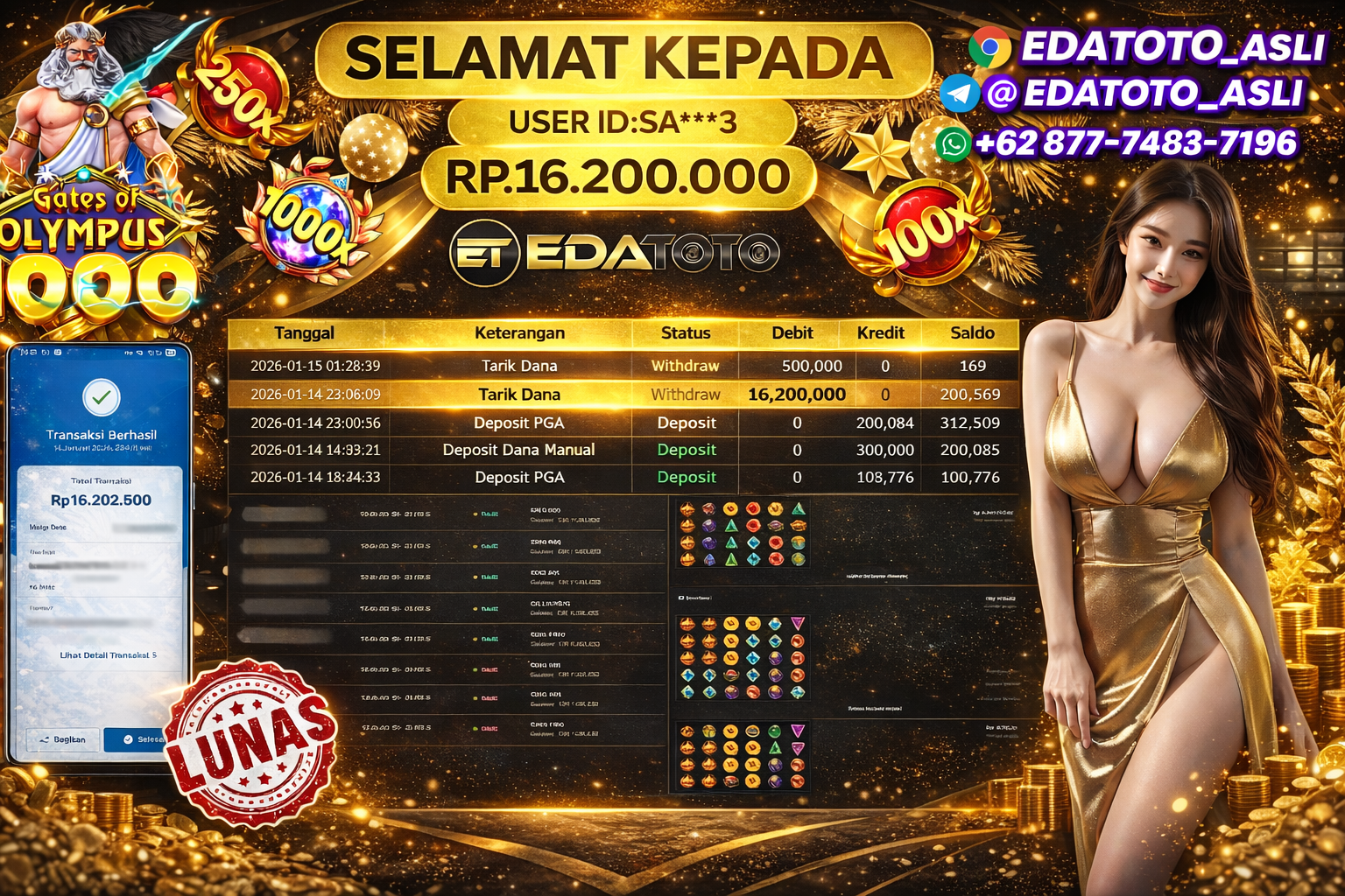 Selamat Kepada Pemilik user ID : SA***3 Hari/Tanggal :kamis/ 14, Januari 2026 Jackpot : Rp. 16,200,000 JT Withdraw : 16,200,000 . . .
