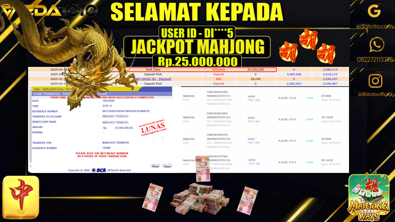 Selamat Kepada Pemilik user ID : DI****5 Hari/Tanggal : MINGGU / 19 , JANUARY 2025 Jackpot : Rp. 25.000.000 JT . . .