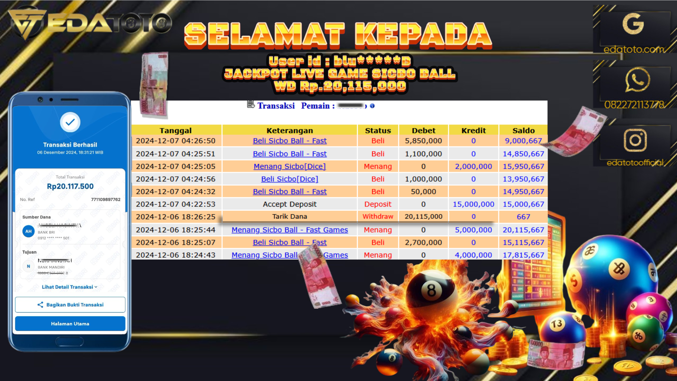 Selamat Kepada Pemilik user ID : blu*****b Hari/Tanggal : Jumat/ 06 DESEMBER 2024 Jackpot : Rp. 20.115.000 JT Permainan : . . .