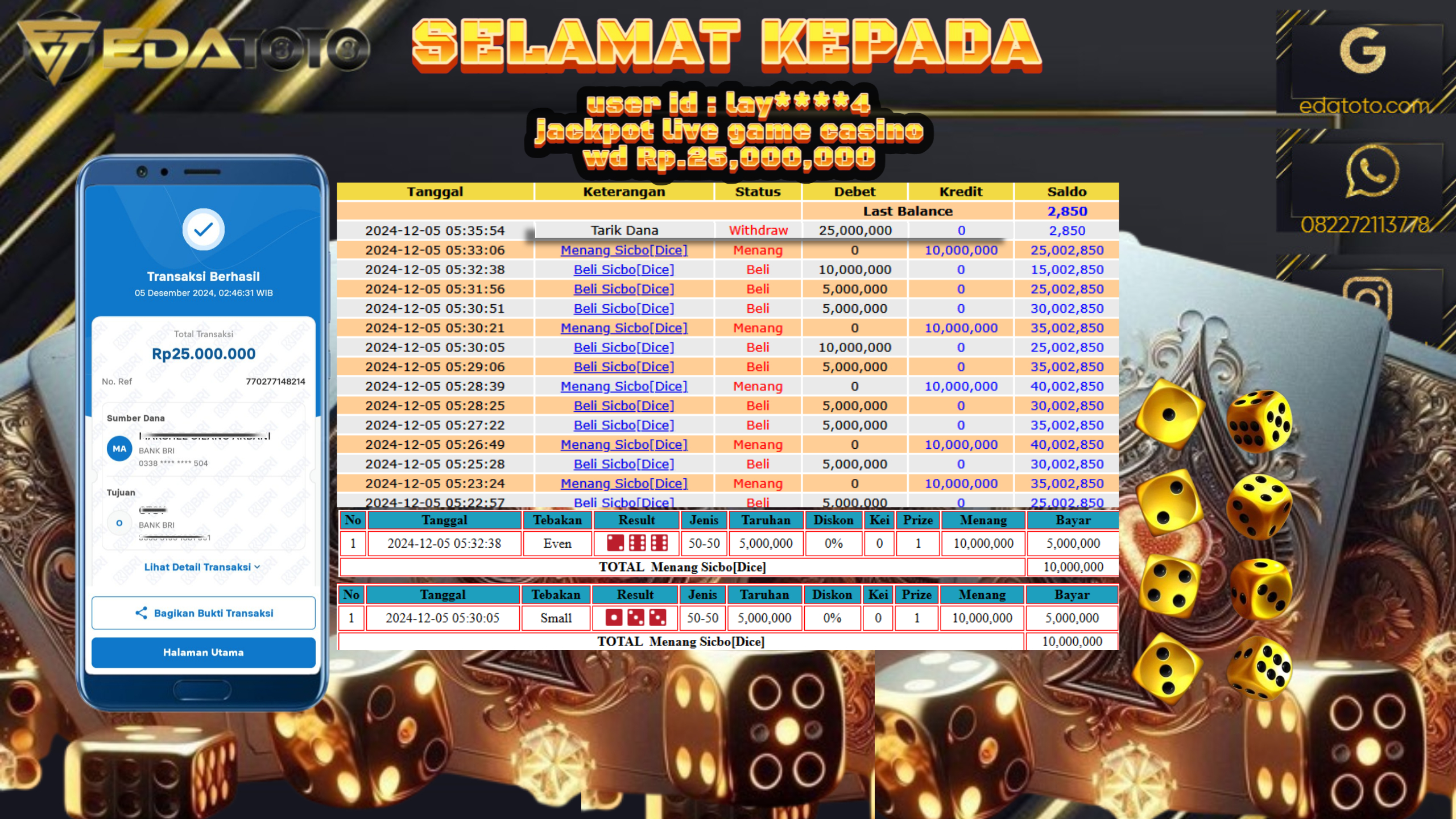 Selamat Kepada Pemilik user ID : lay****4 Hari/Tanggal : Jumat/ 05 DESEMBER 2024 Jackpot : Rp. 25.000.000 JT Permainan : . . .