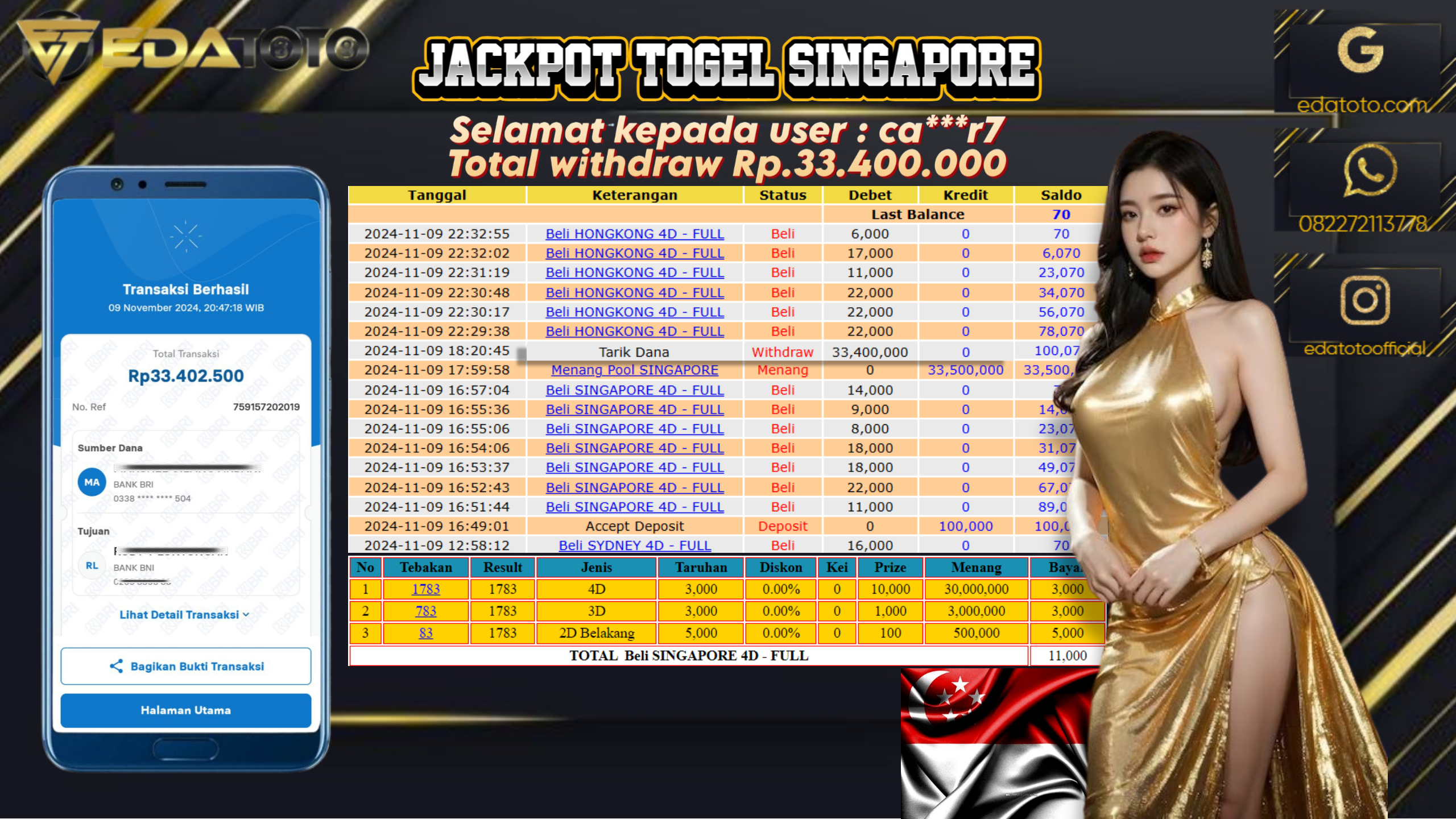 Selamat Kepada Pemilik user ID : ca***r7 Hari/Tanggal : Jumat/ 09 NOVEMBER 2024 Jackpot : Rp. 33.400.000 JT Permainan : . . .